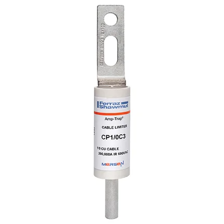 Mersen CP cable protectors are special purpose limiters which are crimped or bolted to cables to clear and isolate faults quickly, increasing the reliability of service entrance and distribution runs. They are current-limiting with a 200,000A interrupting rating, yet will carry low cable overloads which are handled by standard protective devices. Cable protectors are rated in terms of cable size and material (Al or Cu). Heat shrinkable (HS) tubing can be specified for field installation. For cables smaller than 4/0, class J fuses can be used.