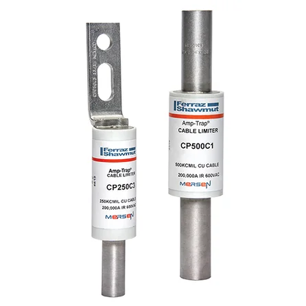 Mersen CP cable protectors are special purpose limiters which are crimped or bolted to cables to clear and isolate faults quickly, increasing the reliability of service entrance and distribution runs. They are current-limiting with a 200,000A interrupting rating, yet will carry low cable overloads which are handled by standard protective devices. Cable protectors are rated in terms of cable size and material (Al or Cu). Heat shrinkable (HS) tubing can be specified for field installation. For cables smaller than 4/0, class J fuses can be use